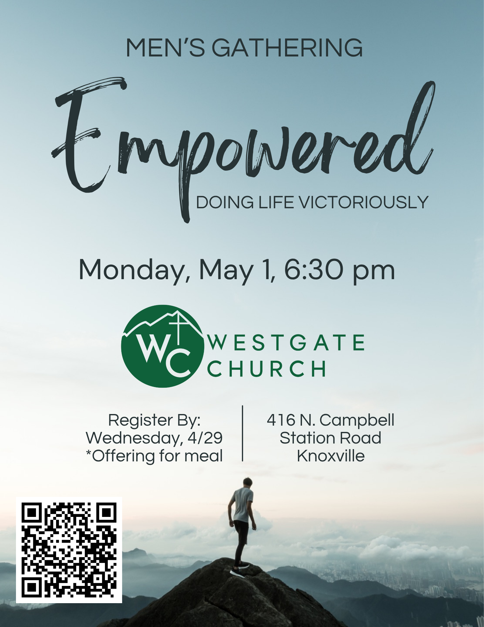 MEN’S GATHERING Friday, May 1, 6:30 pm Grilled Dinner @ 6:30 pmOutdoor Games w/prizesWorship/Prayer for one anotherREGISTER BELOW:
